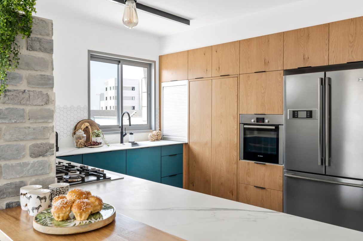 מטבח עכשווי באווירה חמה ומרעננת, עם שילוב ייחודי של נגרות עץ טבעי וארונות תחתונים בגוון טורקיז עמוק. משטחי העבודה הבהירים מאזנים את הצבעוניות ומוסיפים תחושת ניקיון ואור. קיר הלבנים האפור מוסיף טקסטורה ואופי כפרי, בעוד האלמנטים השחורים – ברזים, ידיות וגופי תאורה – מחדדים את הקו המודרני. מטבח שמצליח להיות גם פונקציונלי, גם נעים, וגם מלא אופי. מעצבות : נטע לי וסטפני צלם : מאור מויאל